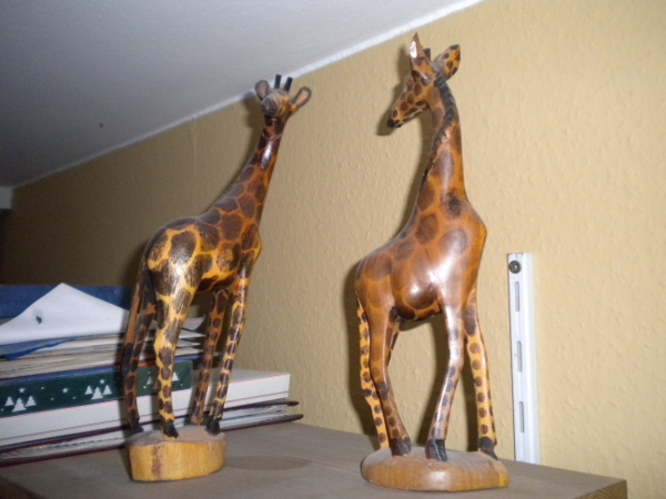 Die Giraffen haben meine Eltern aus einer Ihrer Reisen mitgebracht. Das Besondere ist, das alles komplett aus einem Stück gemacht wurde. Sehenswert. Allerdings kopflastig und instabil, habe diese nun von unten auf einem Brett befestigt.
